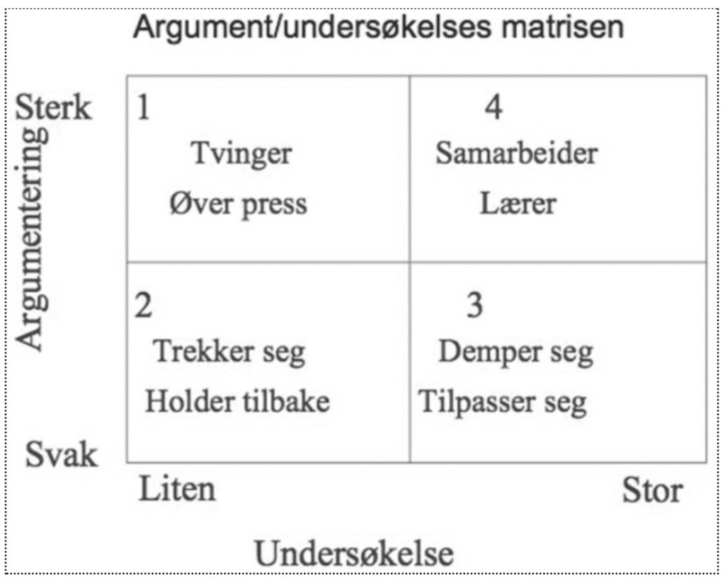 Kvalitet i kommunikasjonen vår kan vi finne i forholdet mellom hvor mye du argumenterer for det du selv mener og tror på, i forhold til hvor mye du er interessert i andres synspunkter, deres rasjonale for disse og forståelse av saken dere samtaler om. Illustrasjonen til venstre her forsøker å reflektere potensialet for forskjellig kvalitet i kommunikasjonen vår langs disse to aksene…