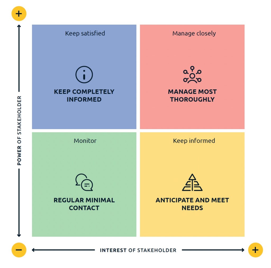 Once stakeholders are identified, they can be categorized by their level of influence – or power – (ability to impact the outcome) and level of interest (the degree to which they care about the issue). Typically, stakeholders are placed in one of four quadrants: