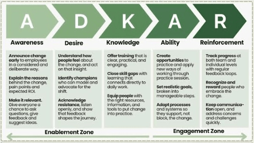 By systematically addressing these five human factors—and using a structured roadmap to guide the process—the ADKAR model aims to maximize the likelihood that organizational changes are successfully adopted and sustained.