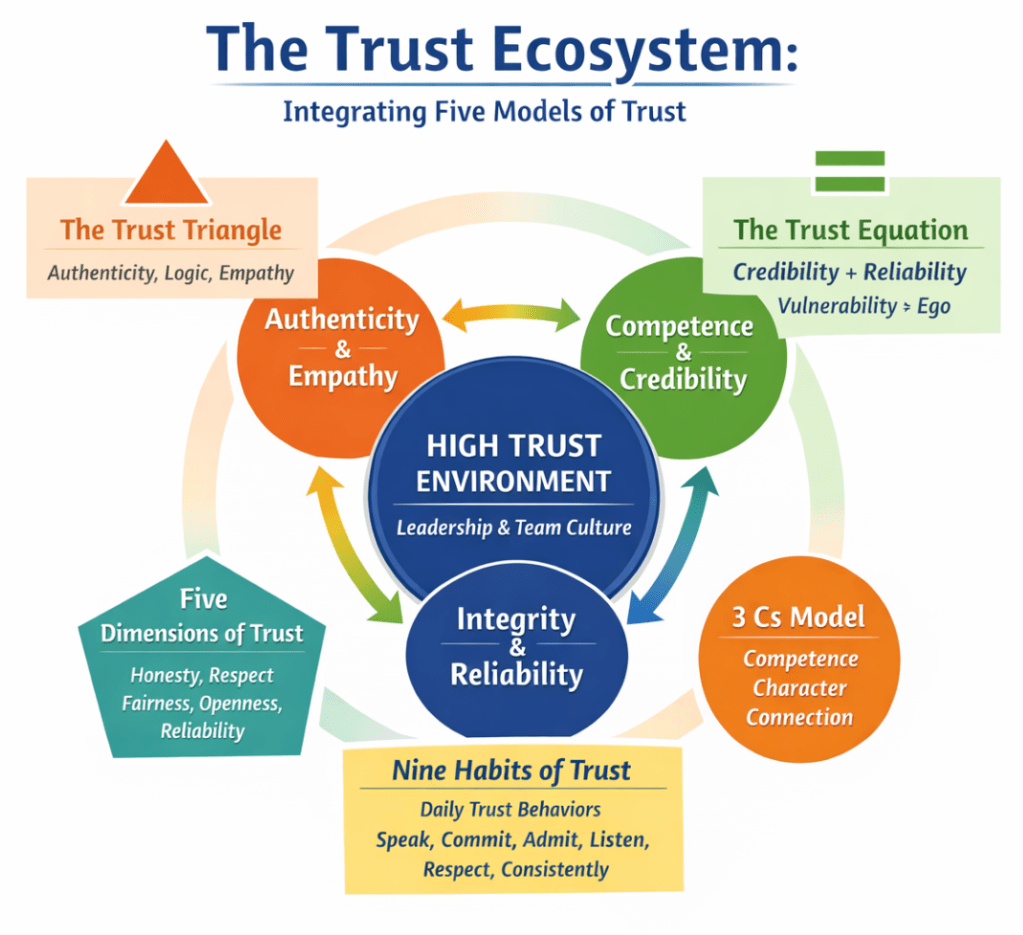 Trust is not a single action, a personality trait, or a feeling. It is the cumulative result of patterns—patterns of behavior, integrity, and relational connection. One model may highlight leader behavior (Nine Habits), another the relational environment (Five Dimensions), and another the cognitive and emotional balance of decision-making (Trust Triangle). Using these models together provides both diagnostic clarity and practical guidance.